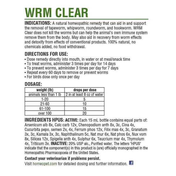 - Homeopet Wrm Clear Is A Low Dilution, Highly Effective, Natural Product And As With All Medications, It Is Important To Monitor Your Petsâ Condition Closely. Although Rare, Severe Infestation May Require Vet Intervention And The Use Of Stringent Chemicals. So Be Vigilant And If In The Slightest Doubt Consult Your Vet.