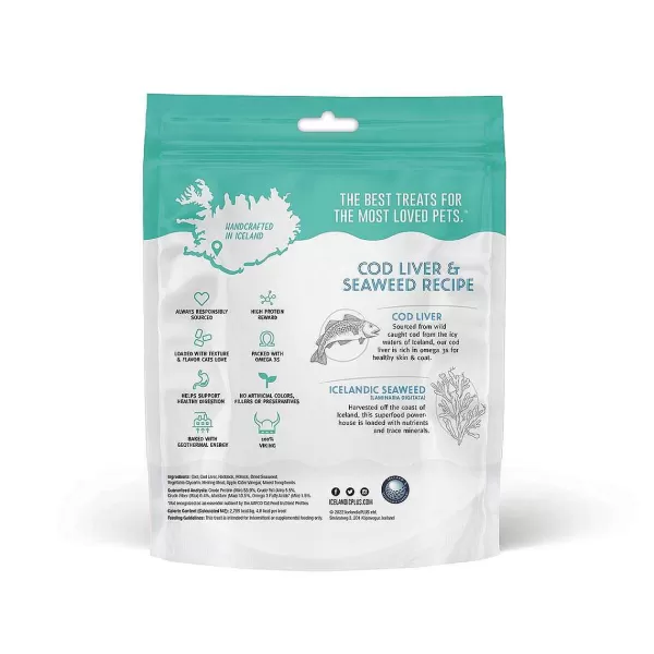 Pure Wild Caught Fish Treats For Cats. Seaweed Sustainably Harvested Off The Coast Of Iceland. Slow Baked Using Geothermal Based Energy. Contains Cod, Cod Liver, And Seaweed. Grain Free Cat Treat. For Healthy Skin And Shiny Coat. Full Of Omega-3 Fatty Acids.